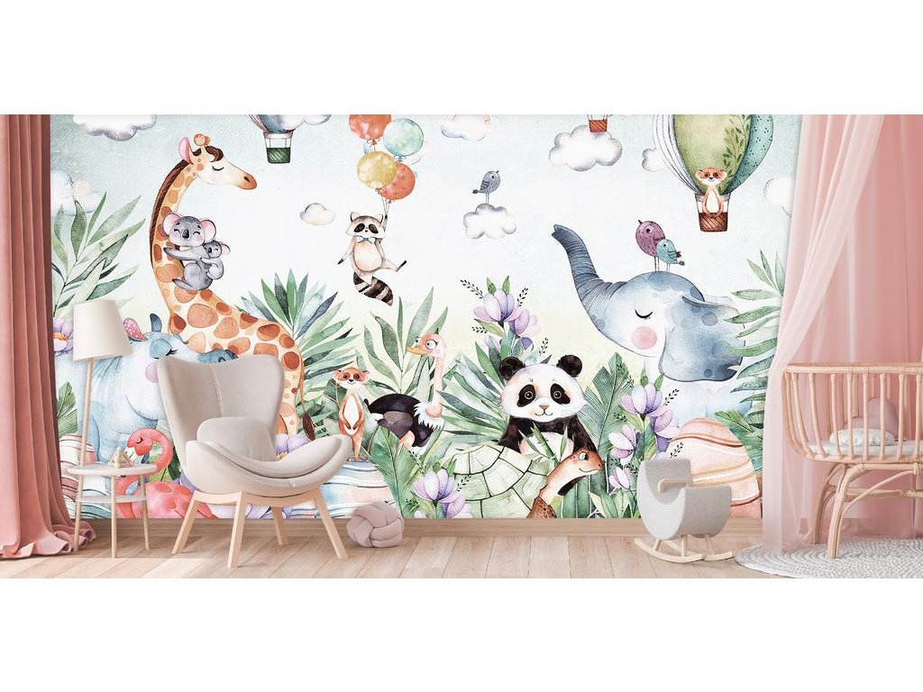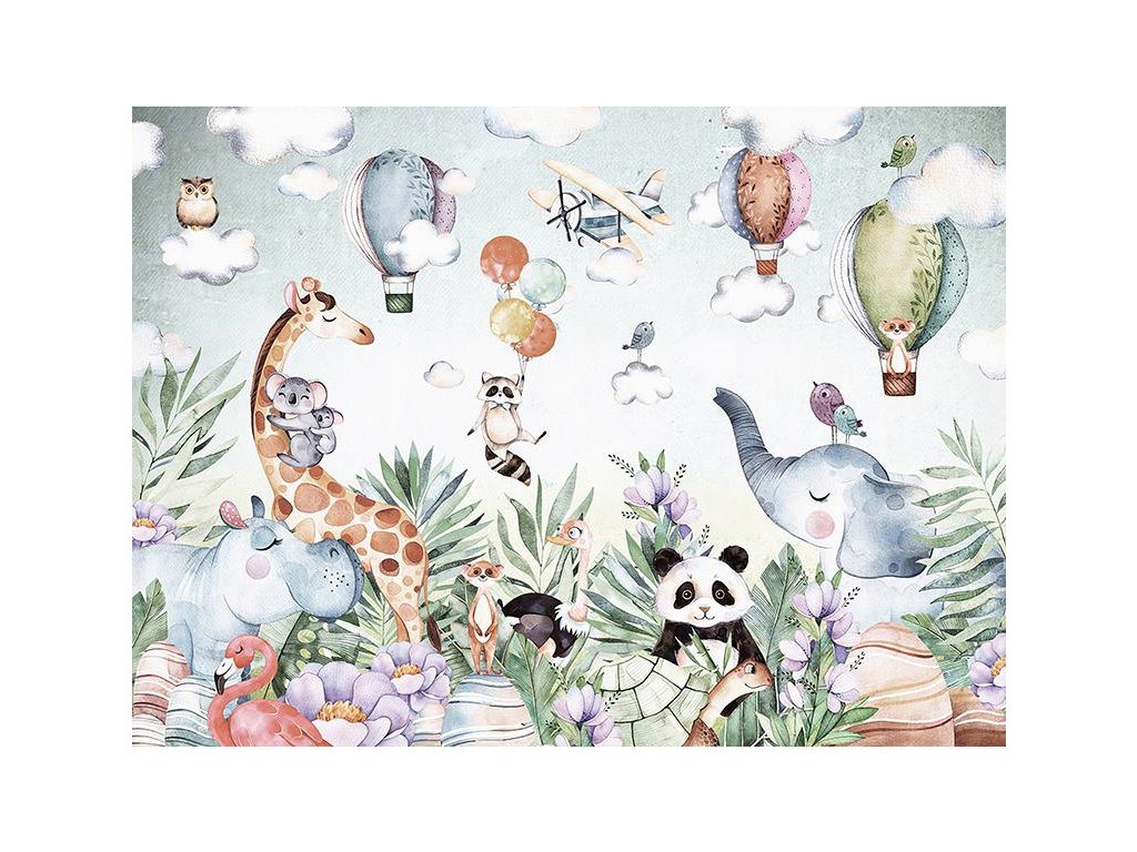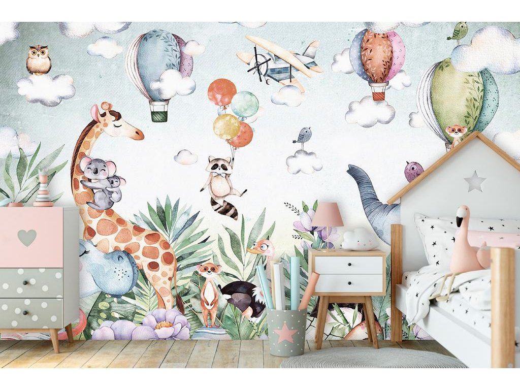 Fototapeta s roztomilými ilustracemi zvířátek v safari stylu, doplněná balóny, letadly a mraky, vytvoří hravou a veselou atmosféru v dětském pokoji. Ideální pro malé dobrodruhy, kteří sní o výletech do světa zvířat. Tento jemný a barevný design přináší radost a fantazii do každého dětského prostoru.