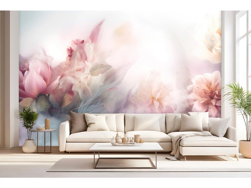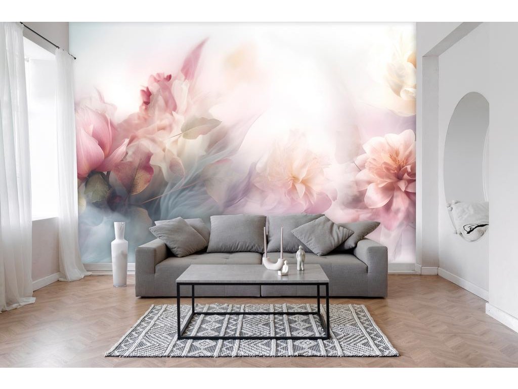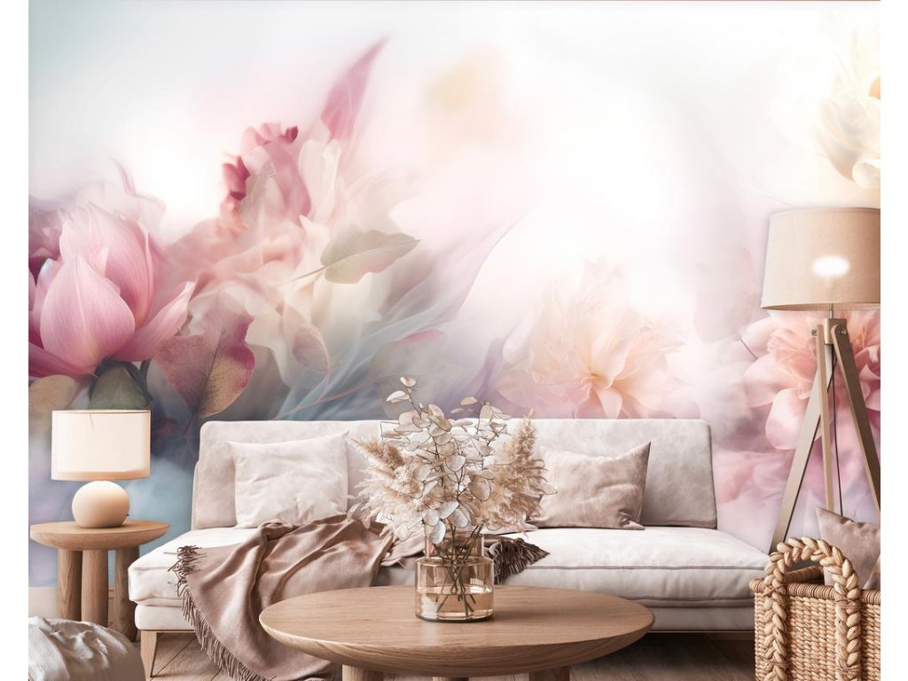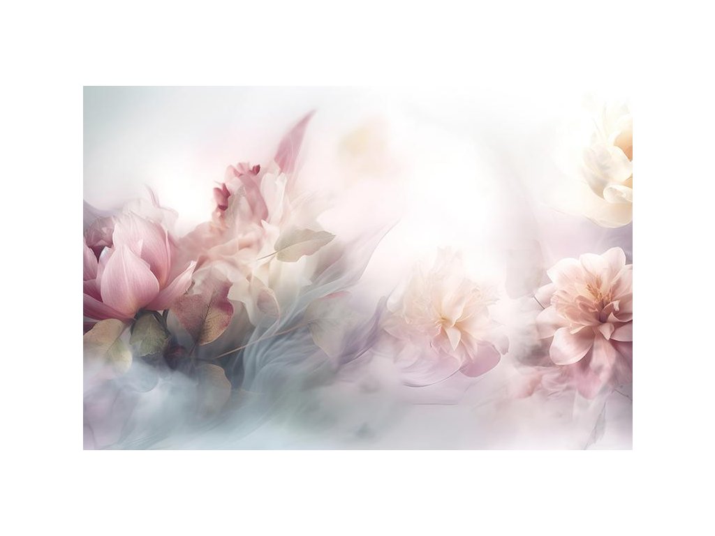 Jemný a éterický motiv plný květinových prvků v tlumených pastelových odstínech přináší do interiéru pocit klidu a lehkosti. Růžové a krémové květy jsou zahaleny v mlžném oparu, což vytváří snovou a romantickou atmosféru. Tento design je ideální pro ložnice, obývací pokoje nebo relaxační prostory, kde chcete vytvořit jemnou, uklidňující atmosféru.