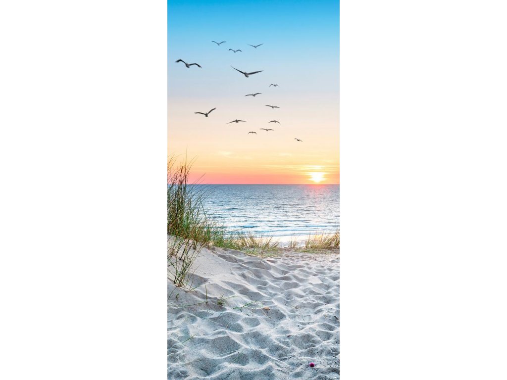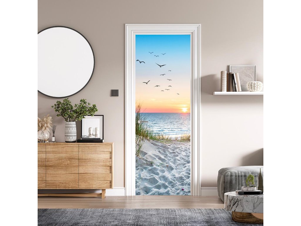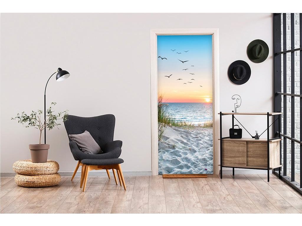 Oživte své dveře a přetvořte je v bránu k moři. Samolepicí fototapeta Pláž při západu slunce dodá vašemu domovu jedinečný charakter a navodí atmosféru letní pláže přímo u vás doma. Snadná aplikace i údržba, luxusní vzhled a pocit originality. Obyčejné dveře proměníte v cestu na pláž při západu slunce.