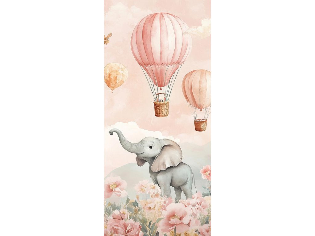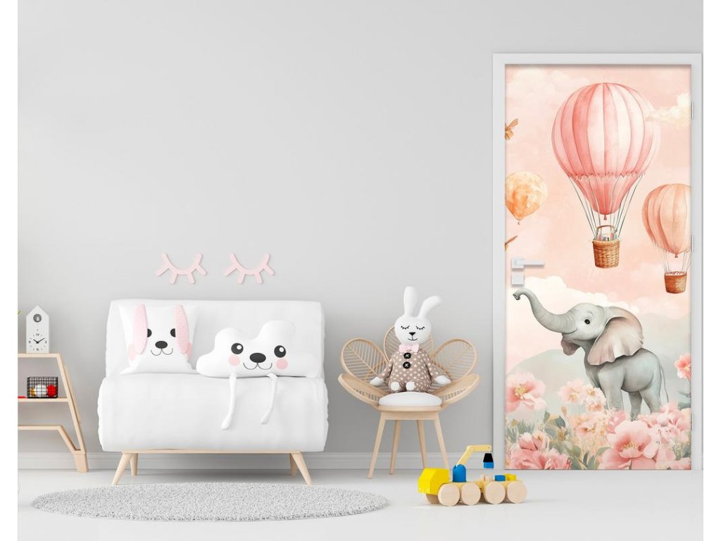 Proměňte obyčejné dveře v bránu do snového safari světa! Samolepicí fototapeta „Růžový safari sen“ je perfektní dekorace pro dětské pokoje – plná pastelových květin, balónků a milých zvířátek.