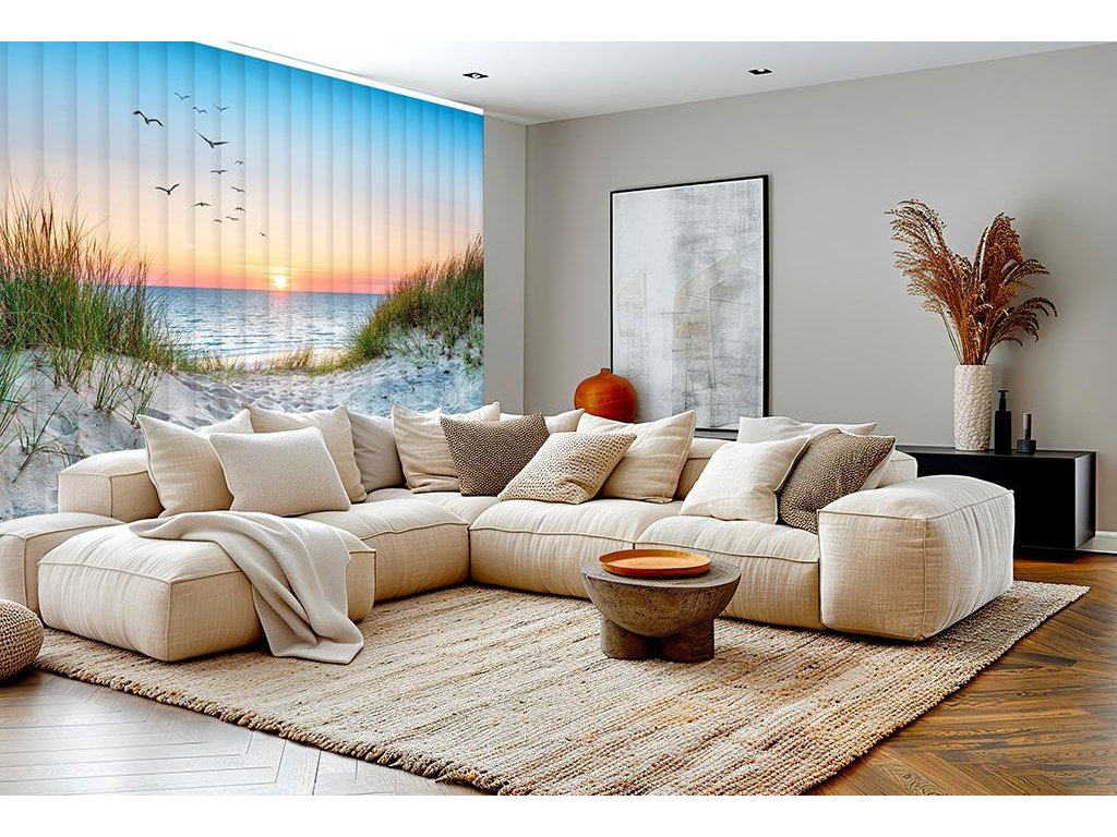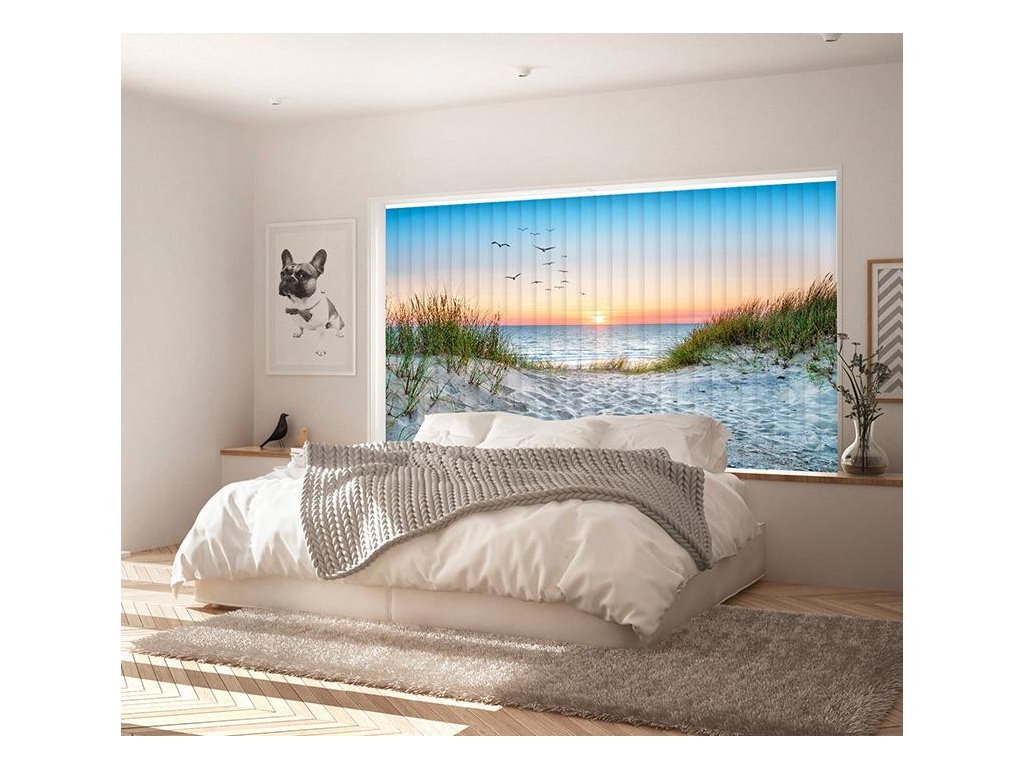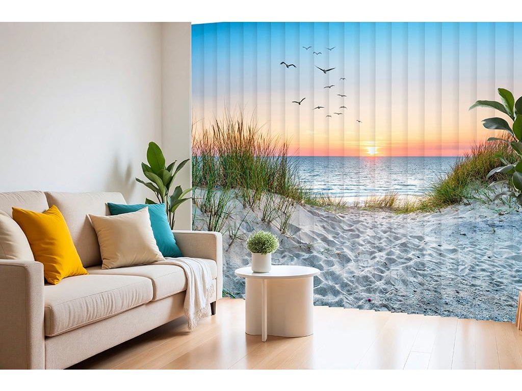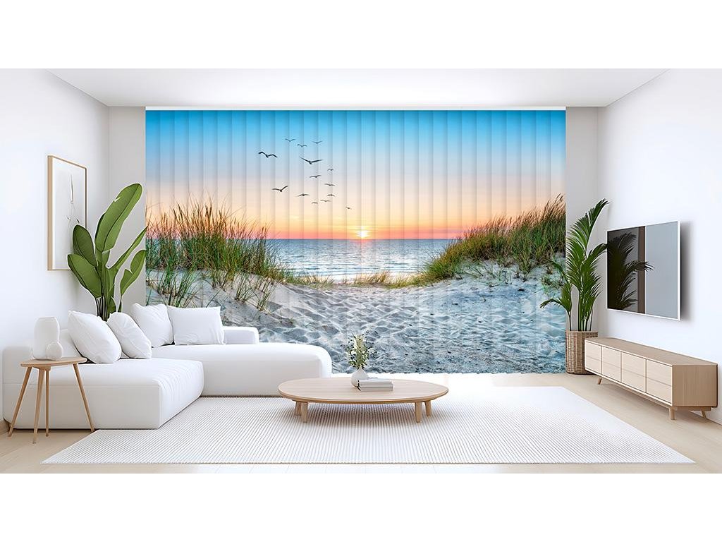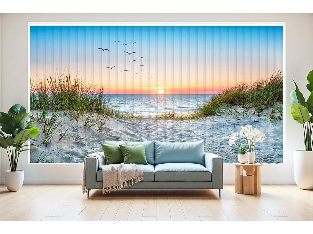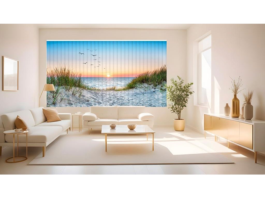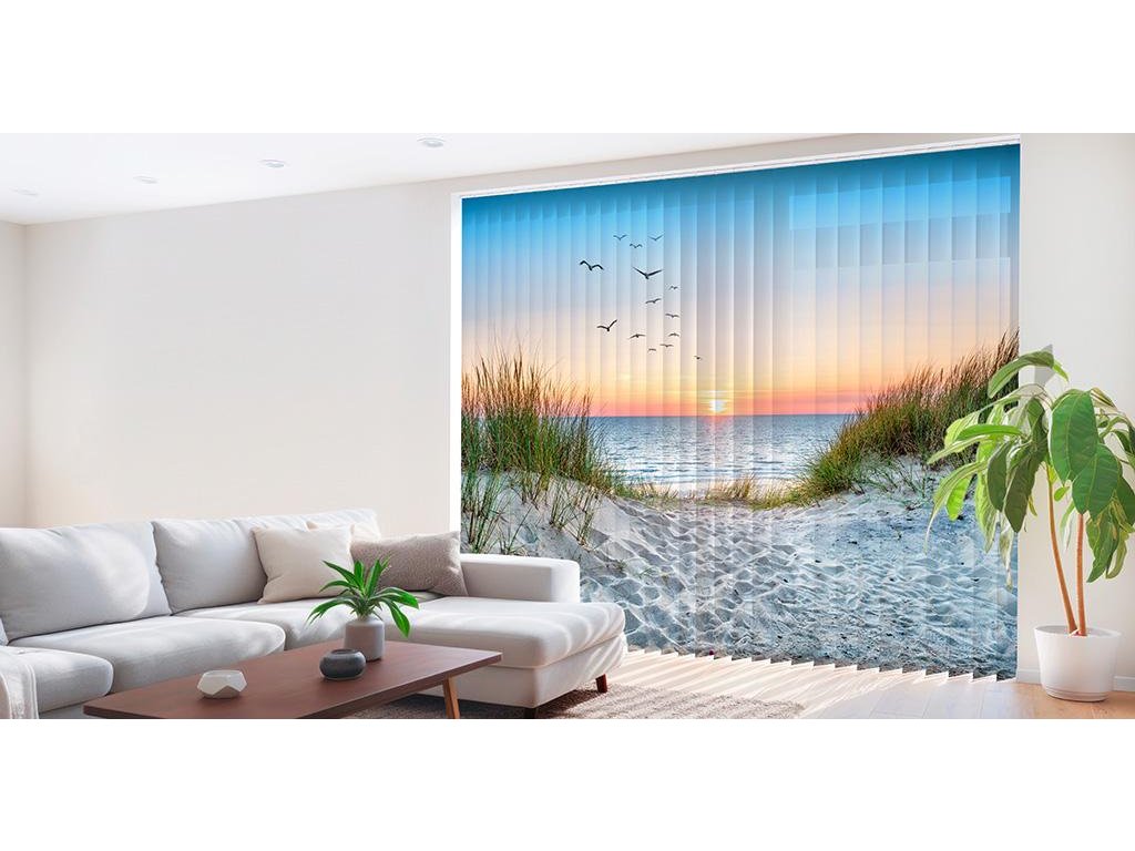 Dopřejte si originální design a dokonalou atmosféru večerní pláže. Fotožaluzie s motivem Pláž při západu slunce spojují praktické stínění s exkluzivním vzhledem, který zútulní každý interiér. Jsou vyrobené na míru a díky ekologickému tisku září přirozenými barvami.